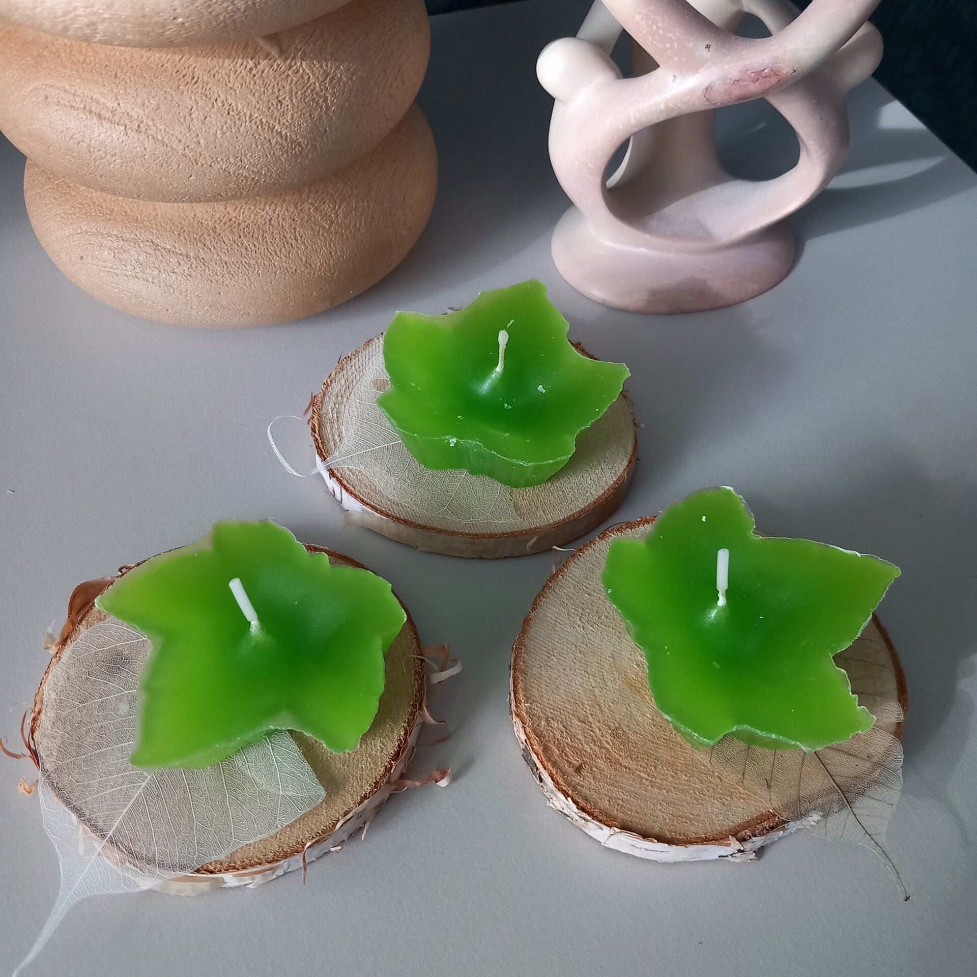 Set van 6 theelichten in de vorm blad en kleur olijfgroen.