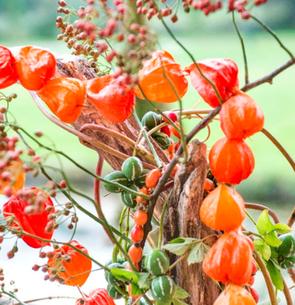 Het herfstseizoen is losgebarsten met al zijn prachtige kleuren en materialen! Daar gaan we gebruik van maken, prachtige bessen, bottels en de lampionnetjes van de Physalis combineren we tot een opvallend object. Op een basis van takken bevestigen we herfstmaterialen met technieken als rijgen en vlechten. Door de materialen op een speelse wijze te verwerken maak je een echte Eyecatcher. Beleef een gezellige creatieve avond en je gaat zeker niet met lege handen naar huis! Dit object droogt prachtig in en is lang houdbaar.
