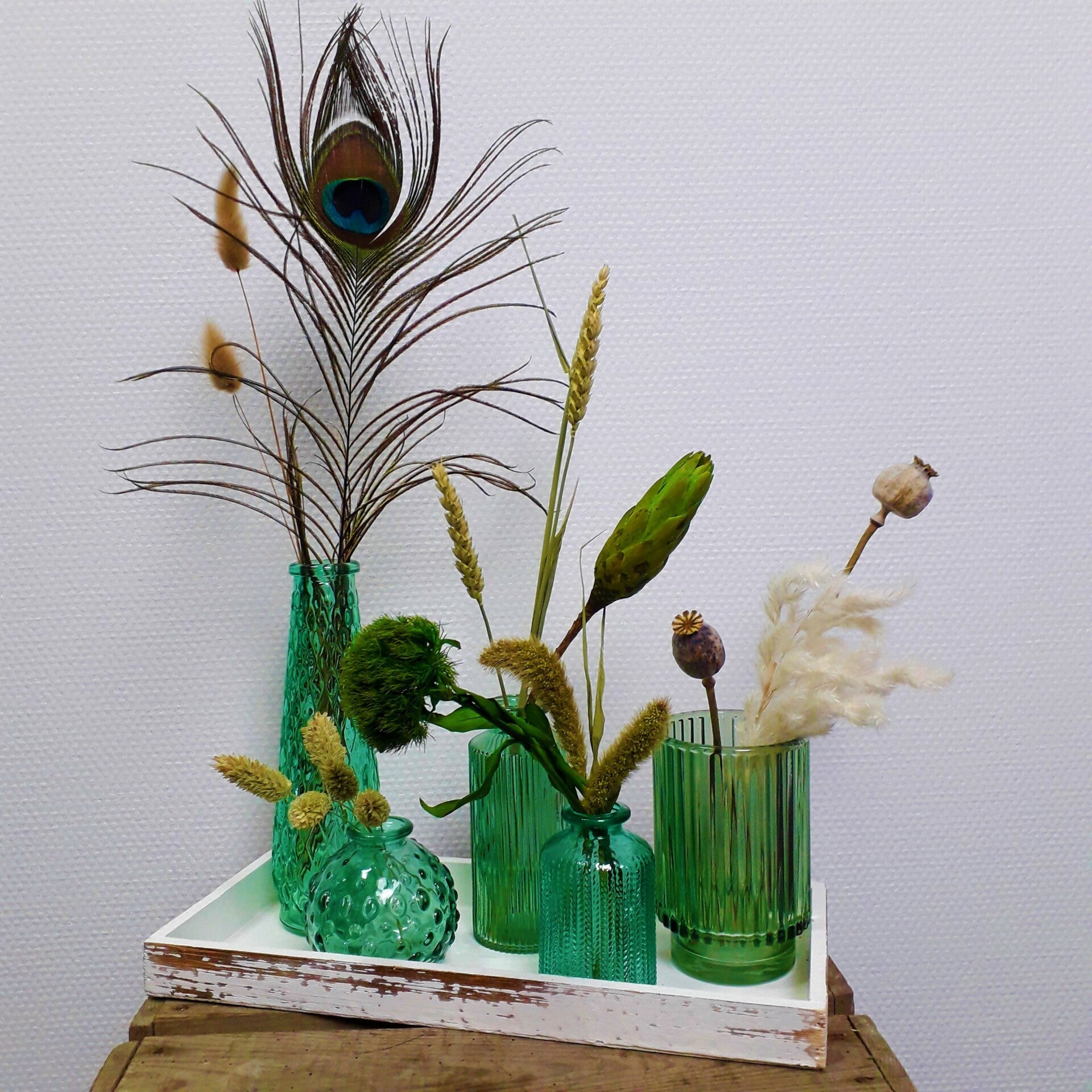 Trendy vaasjes mix. Stijlvol in elk interieur. Met een gemengd bosje droogbloemen samengesteld met de mooiste gedroogde grassen om zelf te verdelen. Blikvangers de Pauwenveer en de Protea.